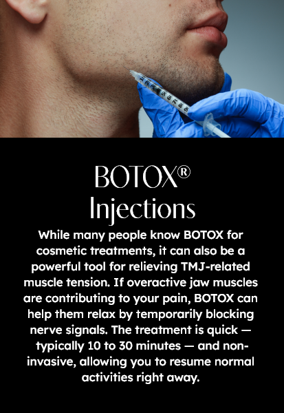 Identifying the exact cause of your TMJ pain is essential for effective treatment. That’s why we utilize a special diagnostic device called a deprogrammer. Worn at night for about two weeks, this appliance gently repositions your jaw, allowing us to observe how your bite naturally aligns when muscle tension is reduced. In some cases, this device alone can provide significant relief.